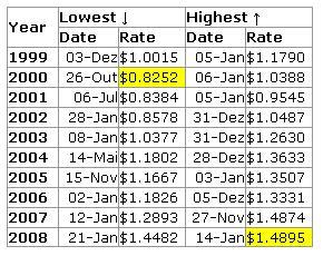 * Eis o câmbio EUR/USD, desde 1999 a 2008:
